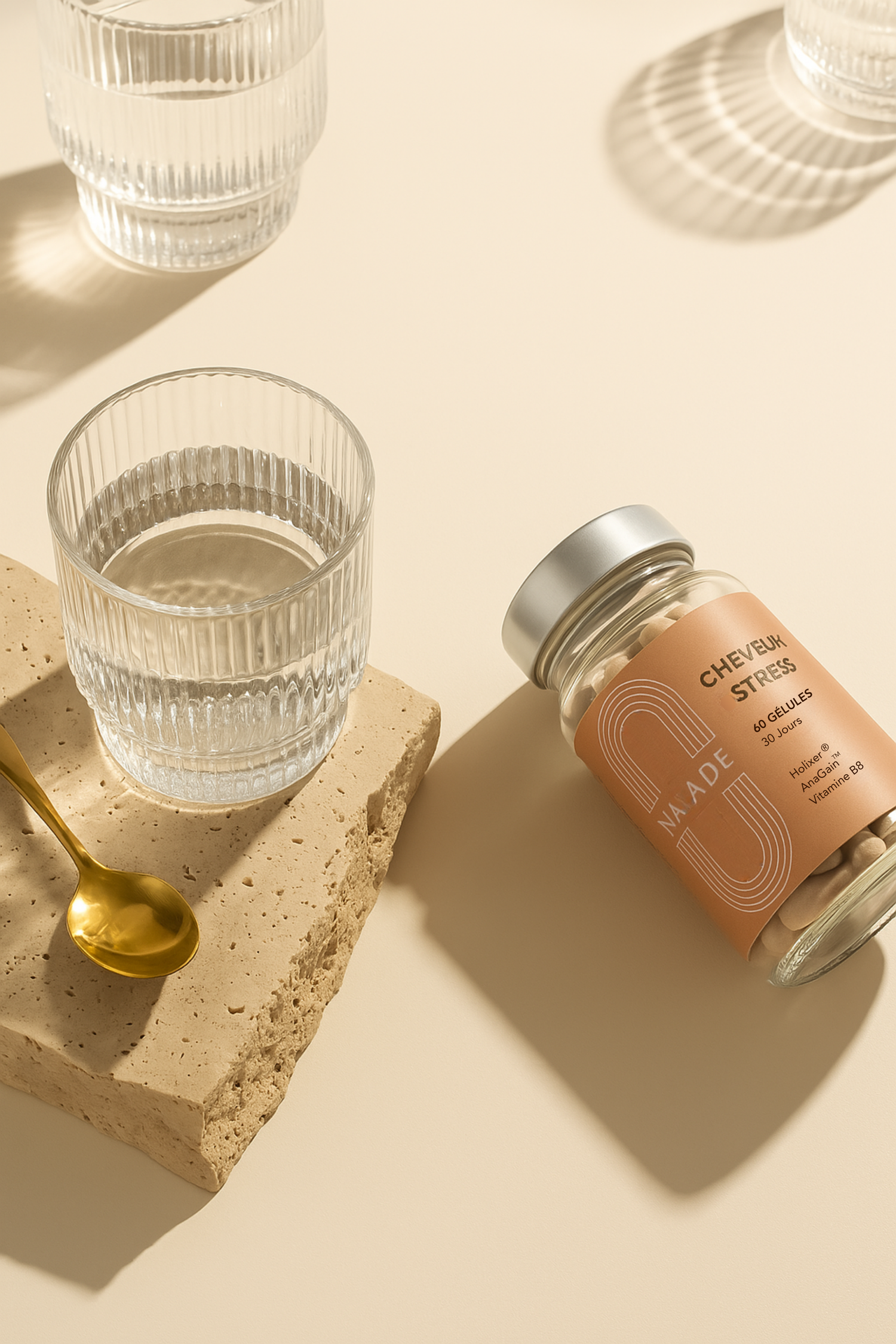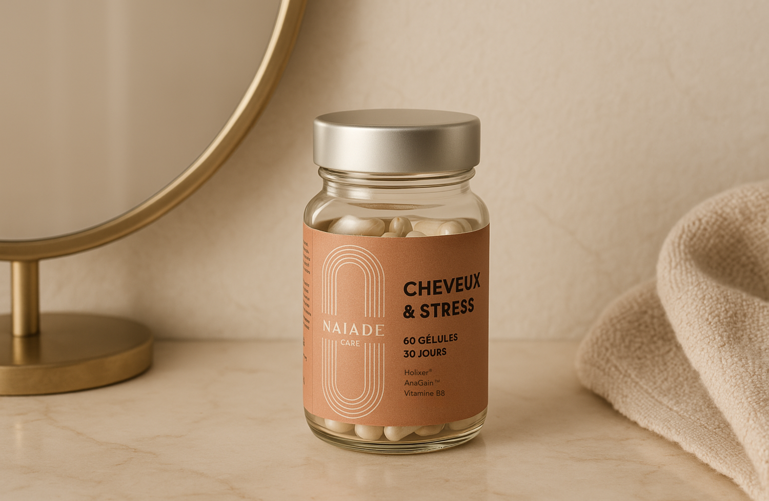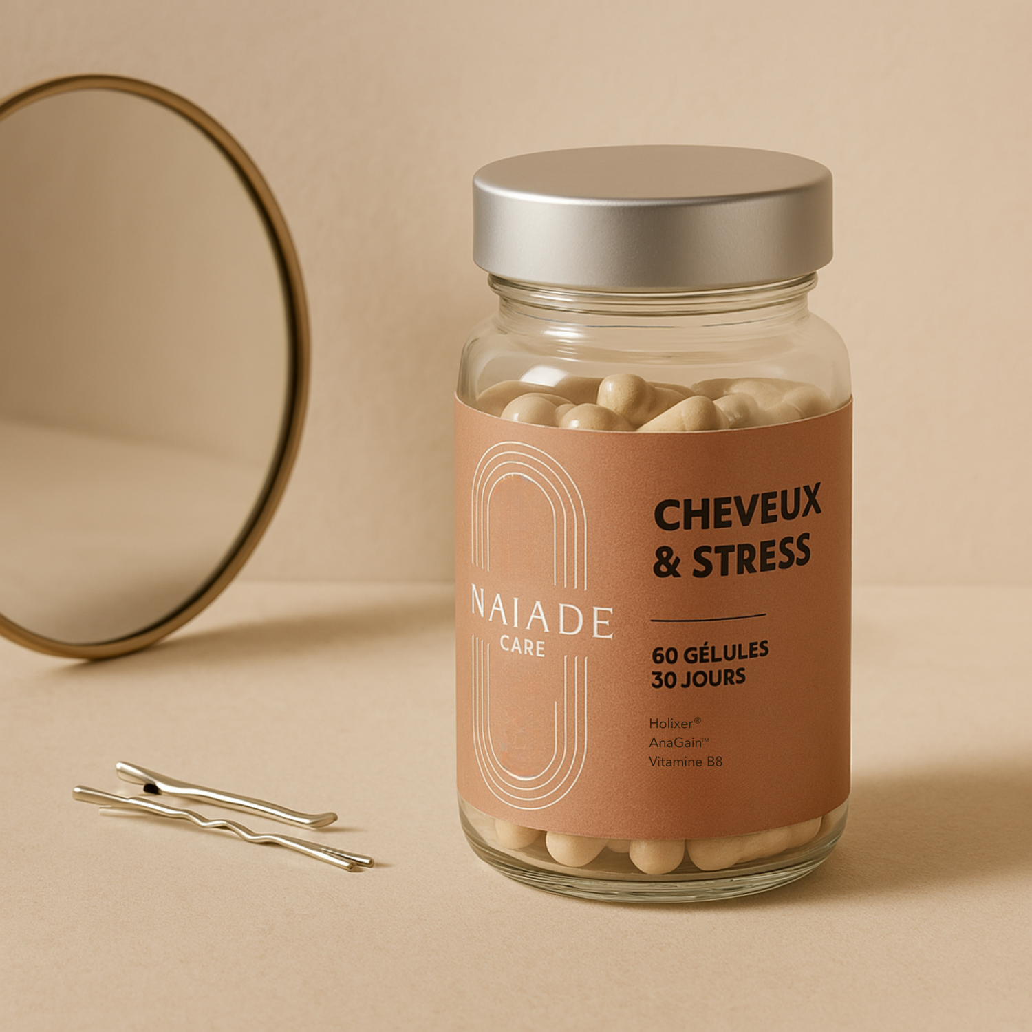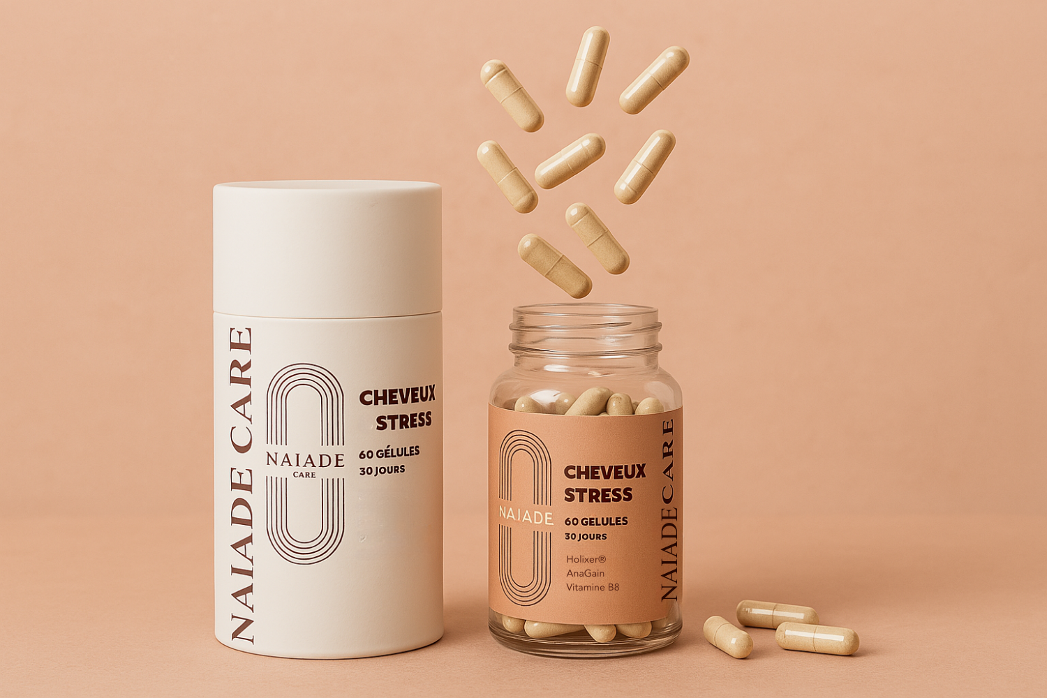 Naiade Care t’apporte le complément alimentaire spécifique pour réduire le stress et renforcer la santé de tes cheveux.